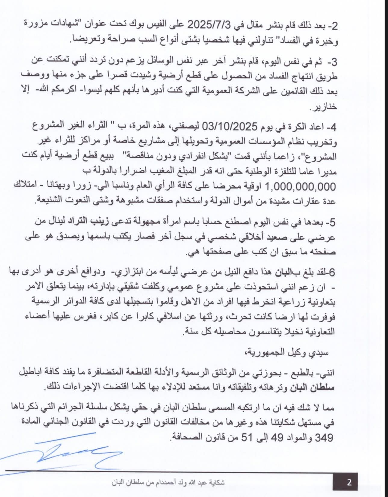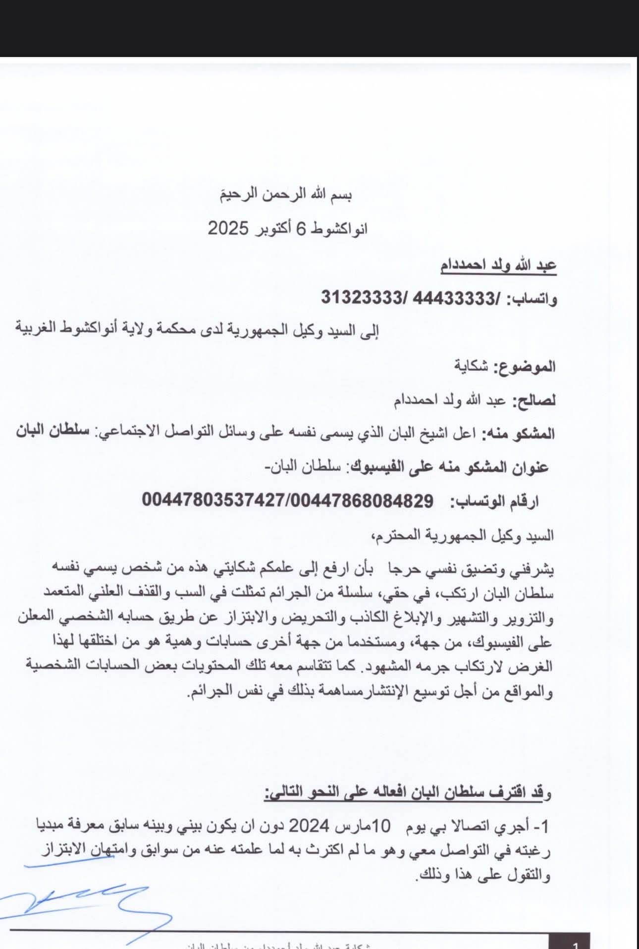 ول احمد دامو يودع شكاية من المدون سلطان البان لدي وكيل الجمهورية بتاريخ 06/10/2025
